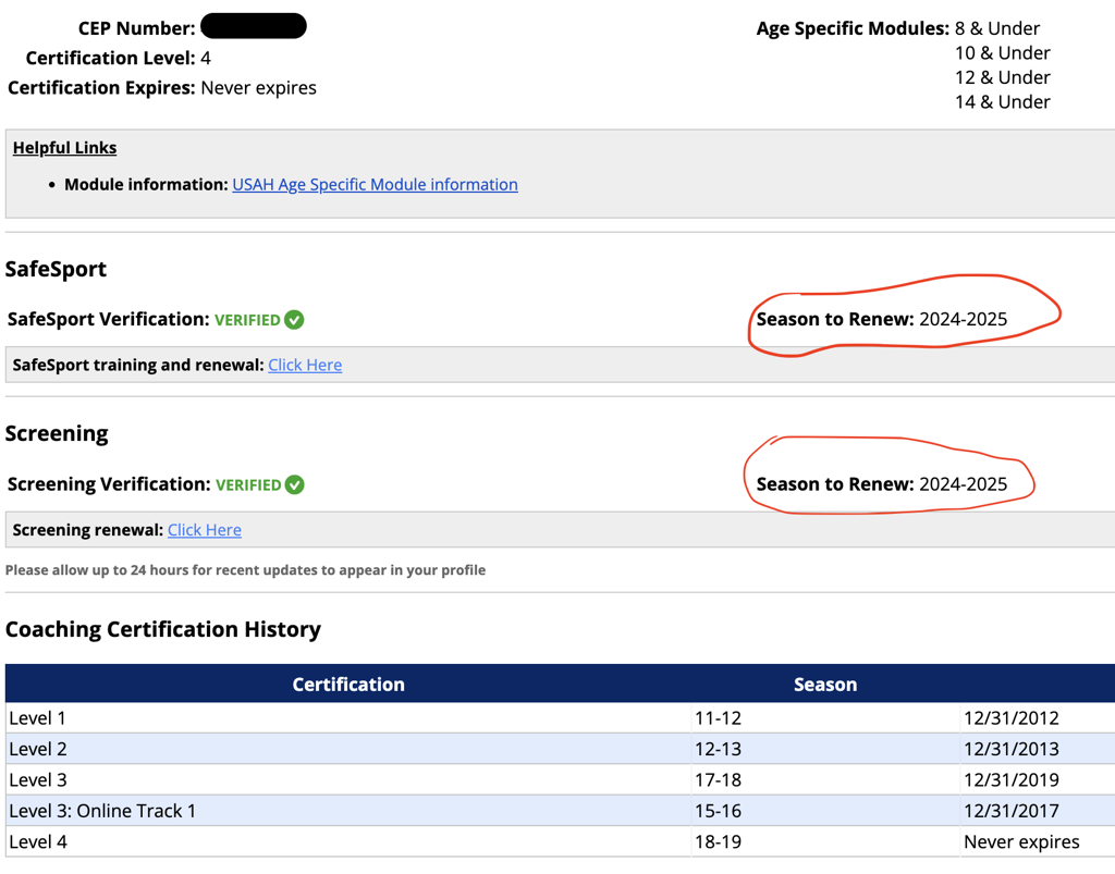 STEP 6: Coaches must complete coaching certifications through the Coaching Education Program (CEP). CEP requirements must be completed by December 31. Mite coaches may have an expired CEP, but all other coaches must renew if necessary. There will be no opportunity to renew after 12/31.